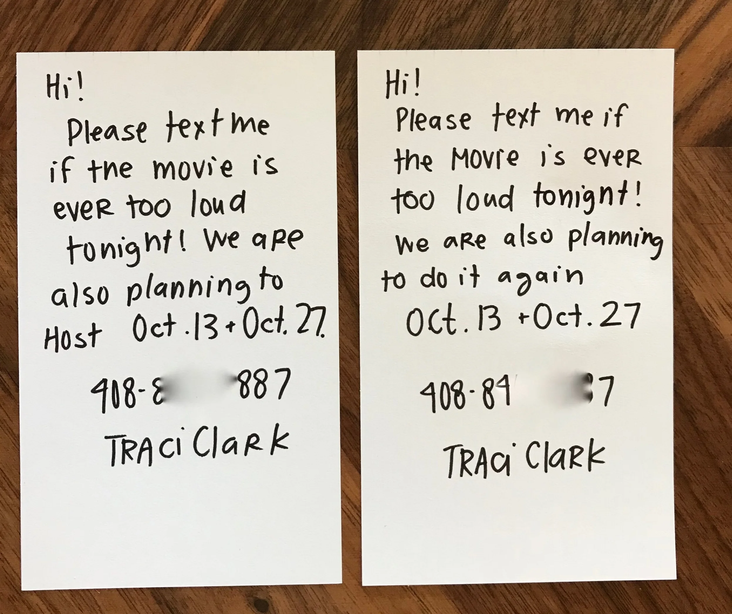 Lastly, we went and met our back-side neighbors and gave them our movie night information written down, along with my cell phone number so they could call/text if it ever got too loud. This is important! You don’t want to start a feud with the neighbors or (God forbid) have the police called for a noise complaint. It was nice meeting them too!