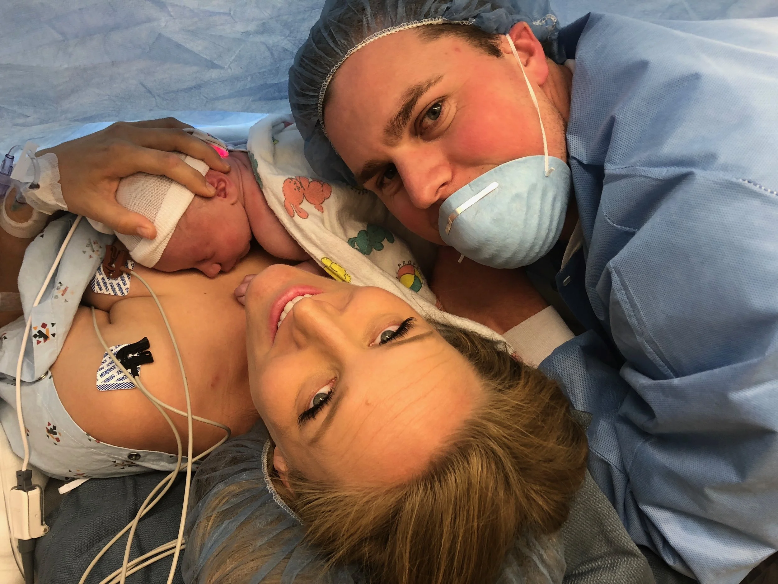 When they are all done they wheel you back to your room (the same room in Labor and Delivery for me). I was managed there for about an hour or so before I was transferred to postpartum. During that time I couldn’t feel or move my legs which was SO WEIRD. I kept saying they didn’t feel like my legs. I had the catheter in. We had some time to do skin to skin, which was great. After 45 minutes or so I had C.J. go grab our families to come see, and they took photos.