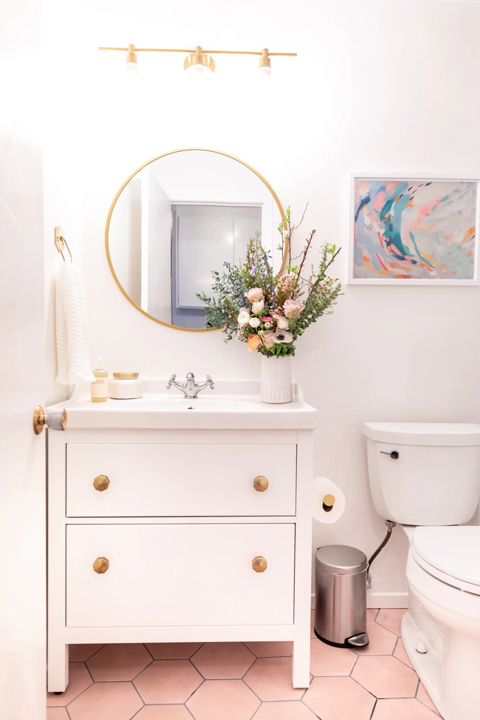Pink Budget Bathroom Renovation: pink hexagon tile with dark grey grout. Guest Bathroom sources: Anthropologie, Target, Urban Outfitters, Wayfair, IKEA, Tilebar, Home Depot, Lowe’s.