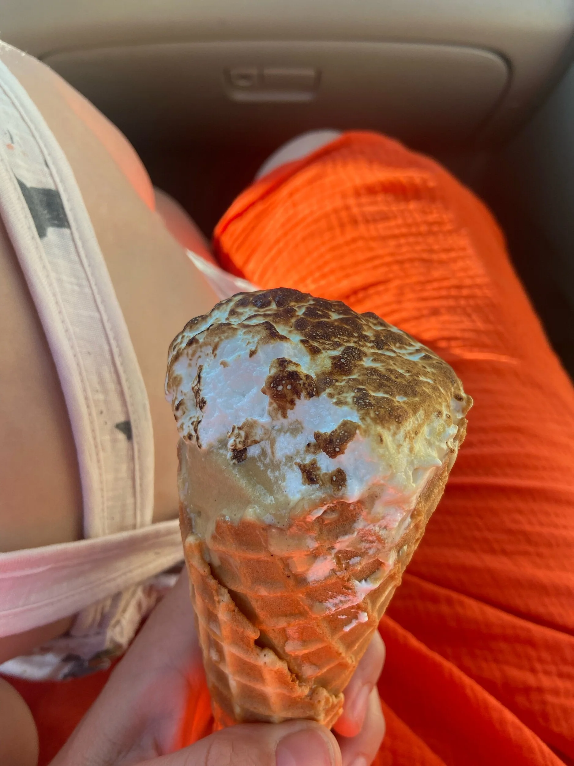 Burnt Carmel Ice Cream with Toasted Marshmallow topping in a freshly made waffle cone from Penny Ice Creamery = the best treat.